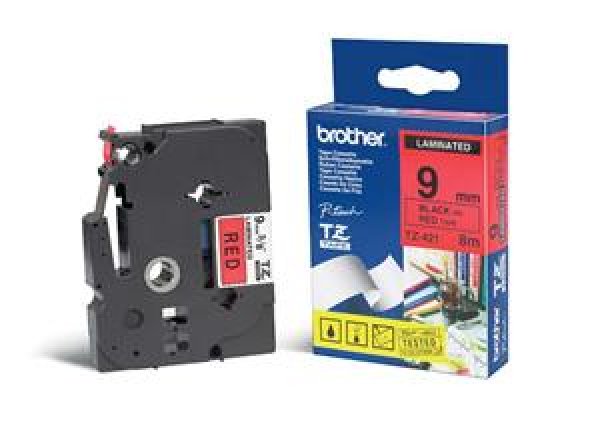 Brother TZe-421 - Standardní lepidlo - černá na červené - Role (0,9 cm x 8 m) 1 kazeta/y lamino páska - pro Brother PT-D210, D600, H110; P-Touch PT-1005, 1880, E800, H110; P-Touch Cube Plus PT-P710